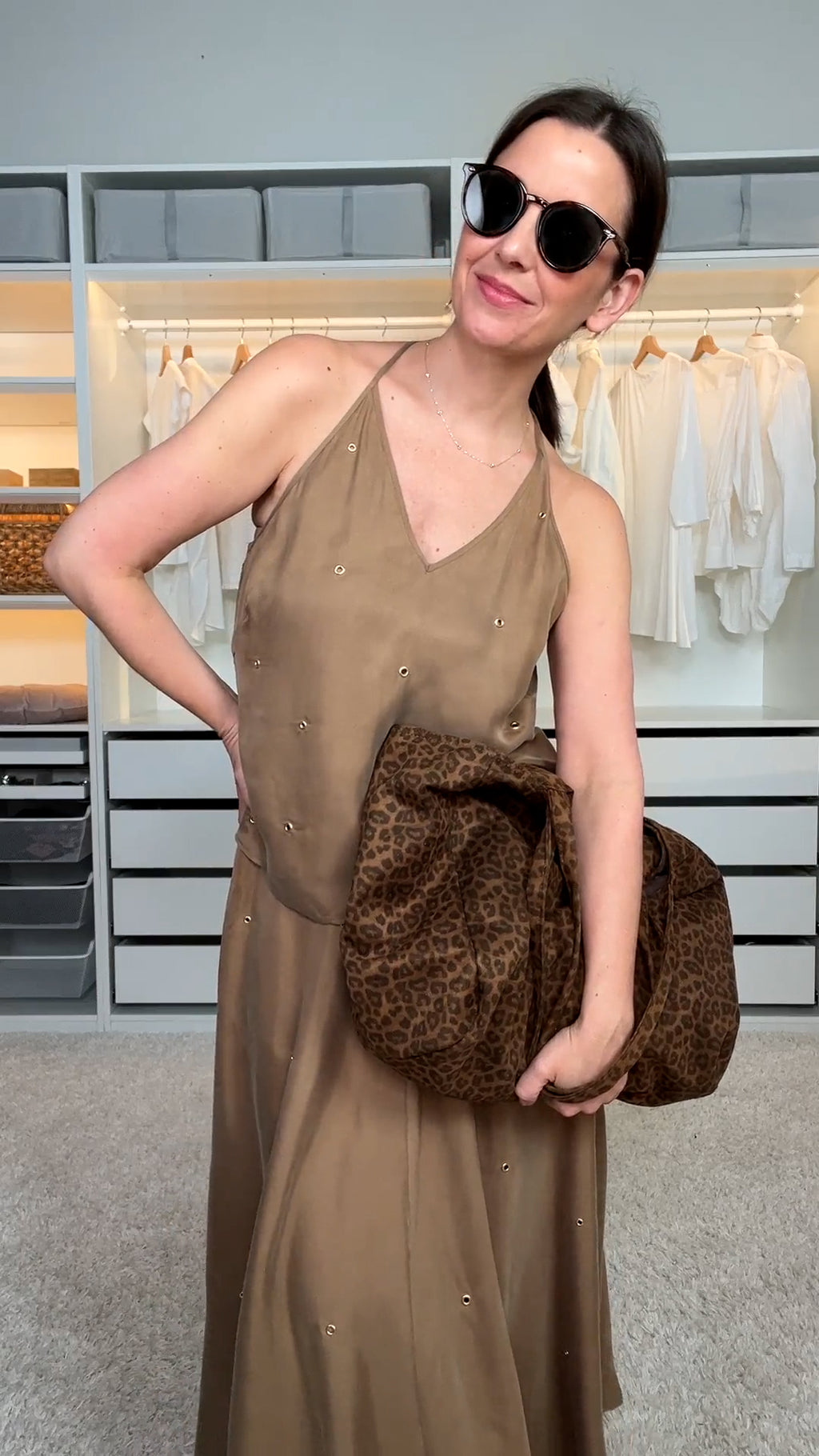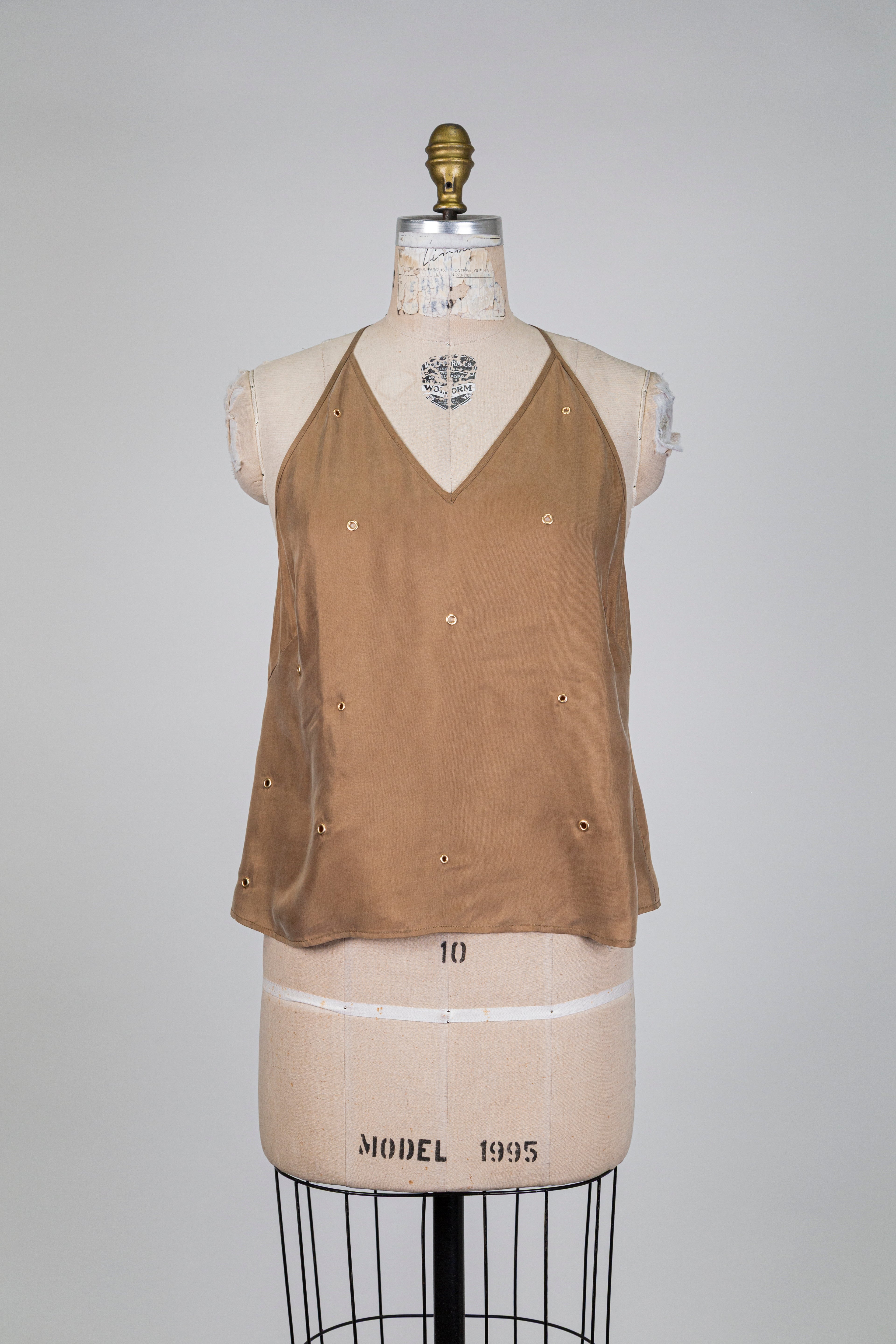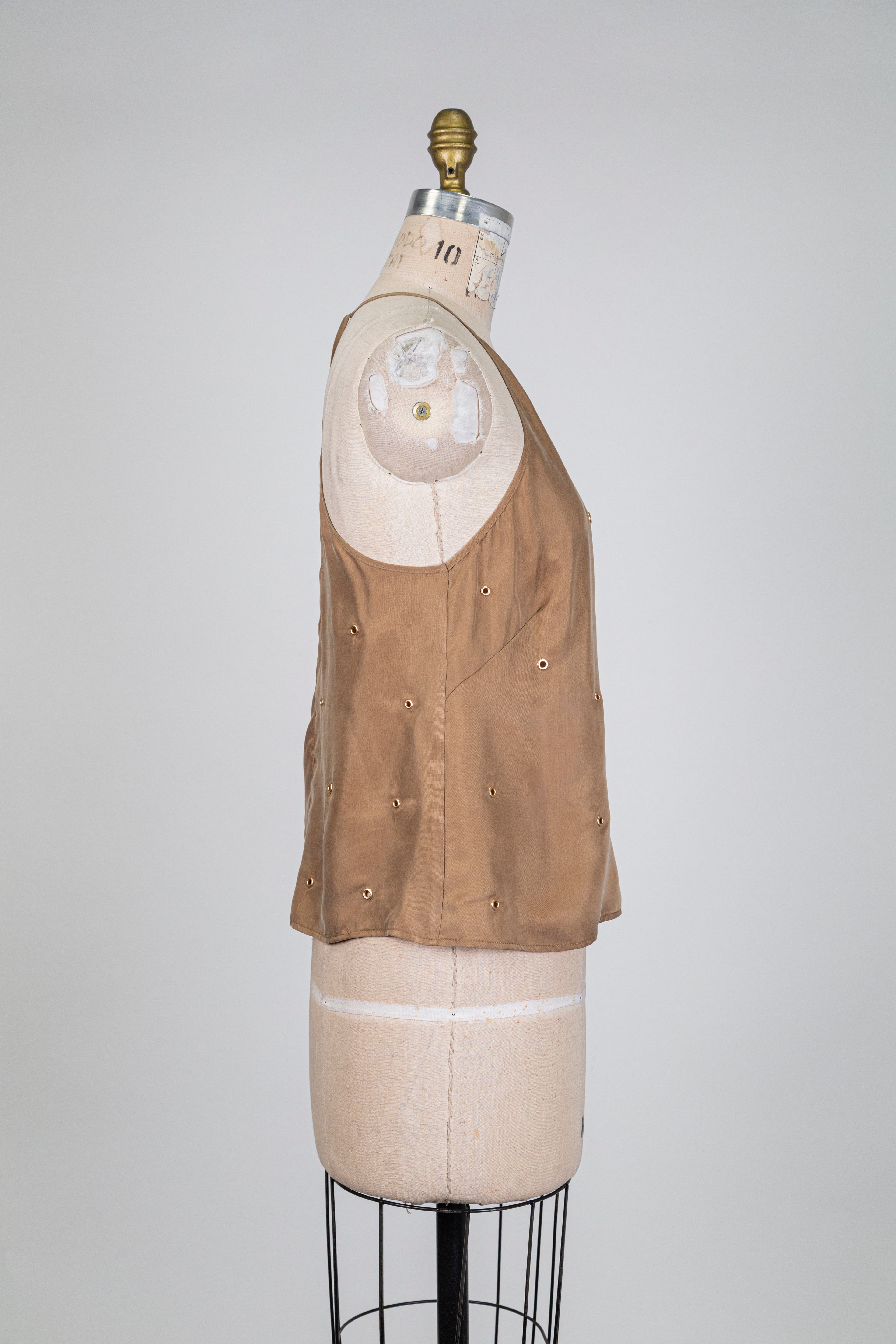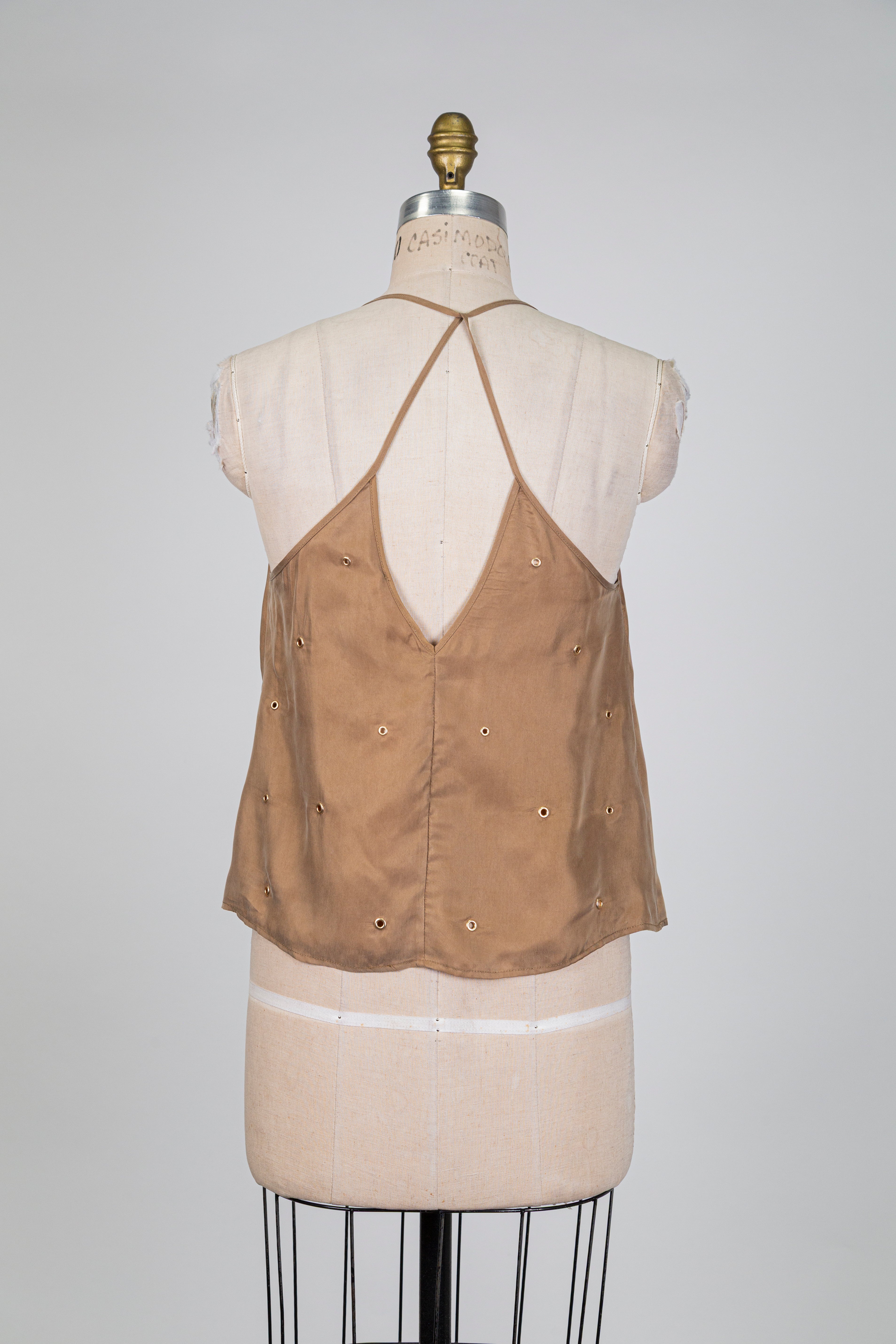 Haut fluide brun à fines bretelles et studs dorés, silhouette légère et féminine ponctuée de studs dorés pour une allure chic et subtilement audacieuse.