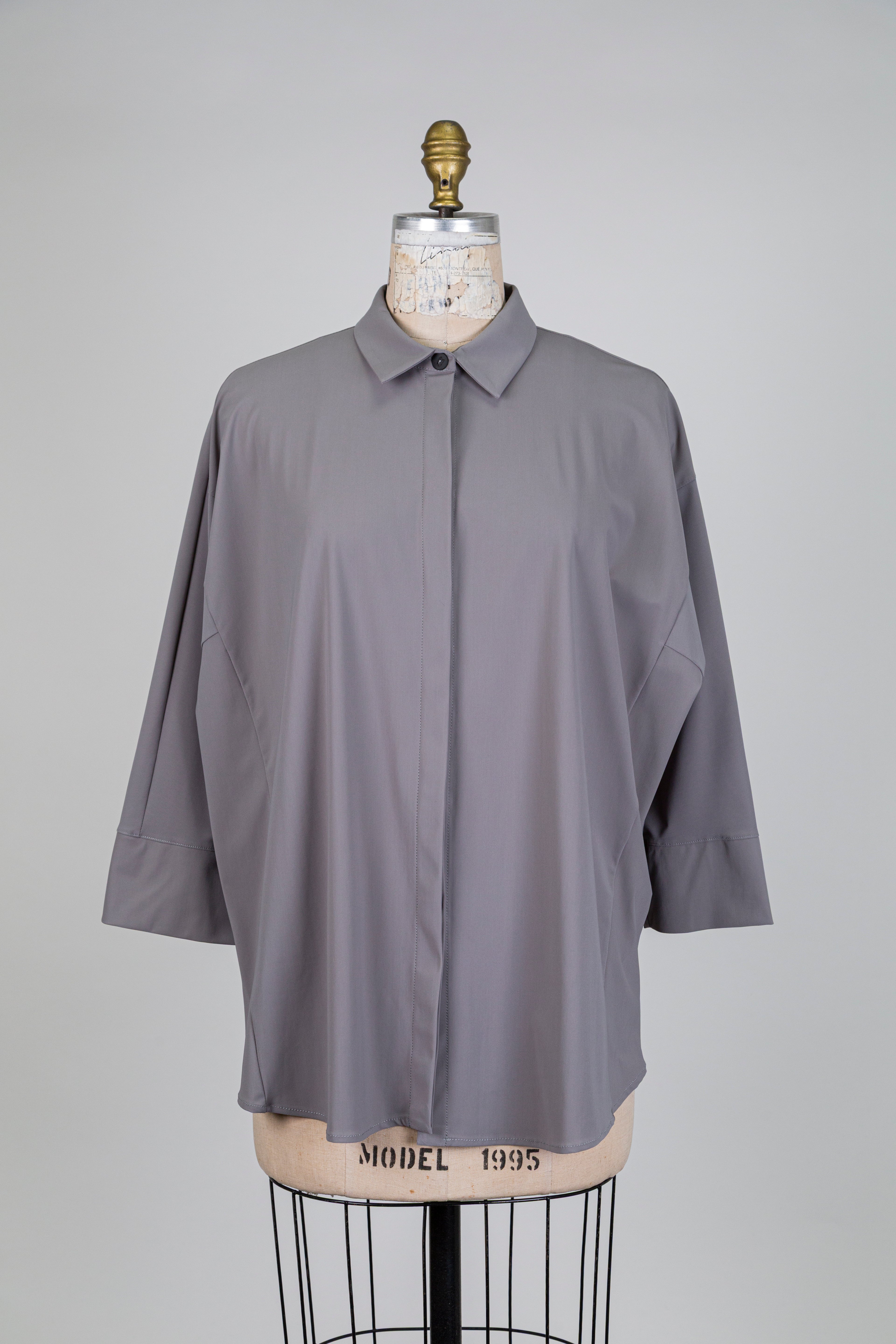 Chemisier gris à boutonnage invisible, pièce épurée où la fermeture dissimulée souligne une allure nette et contemporaine.