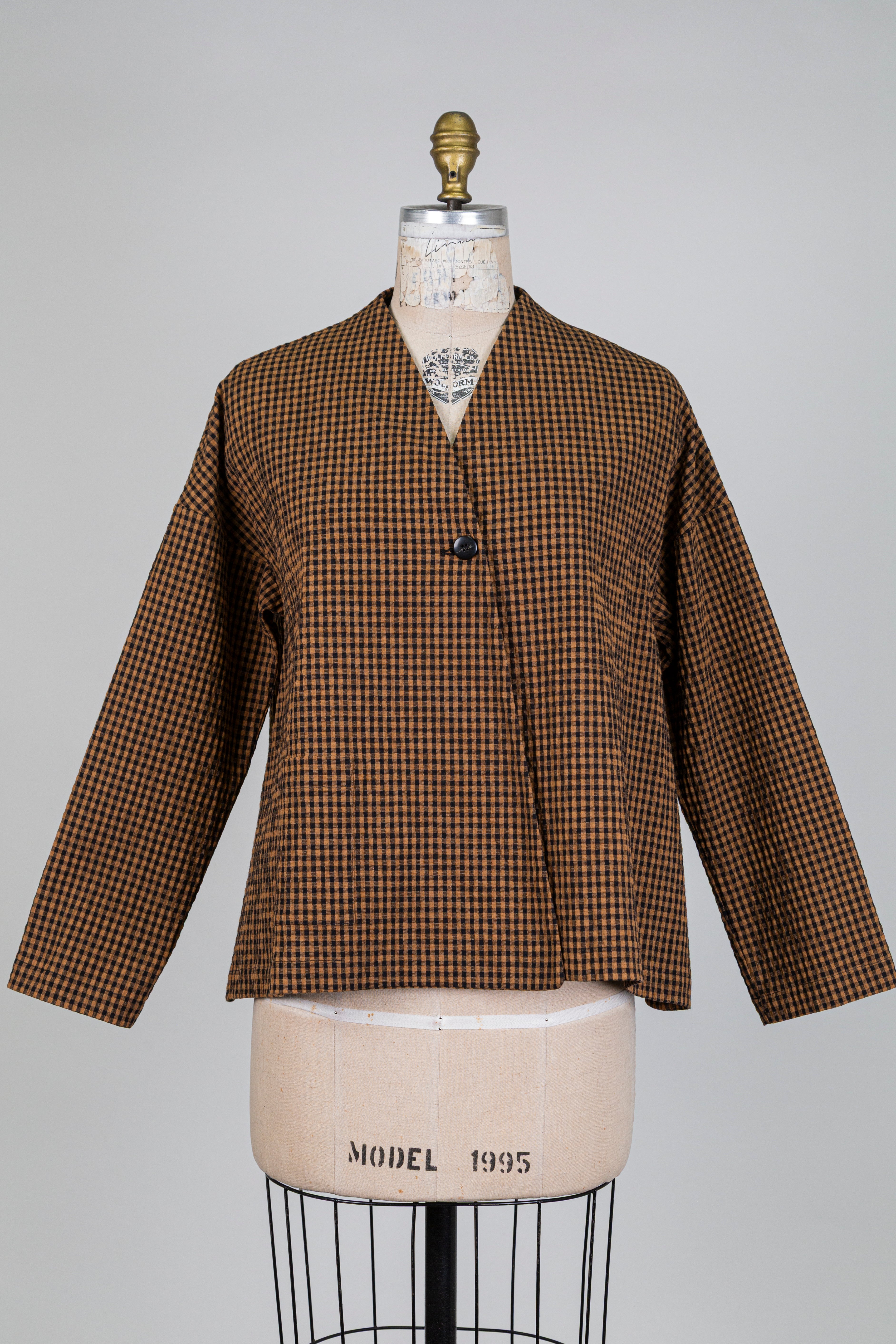 Veste trapèze à motif vichy brun et noir, pièce élégante à la coupe trapèze dont le motif vichy graphique révèle une allure chic et affirmée.
