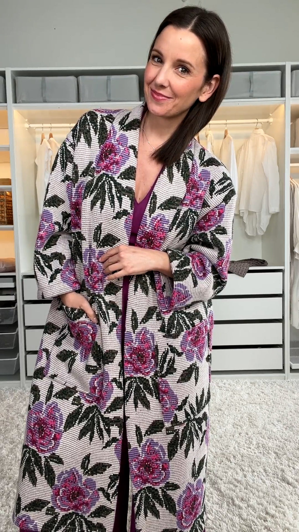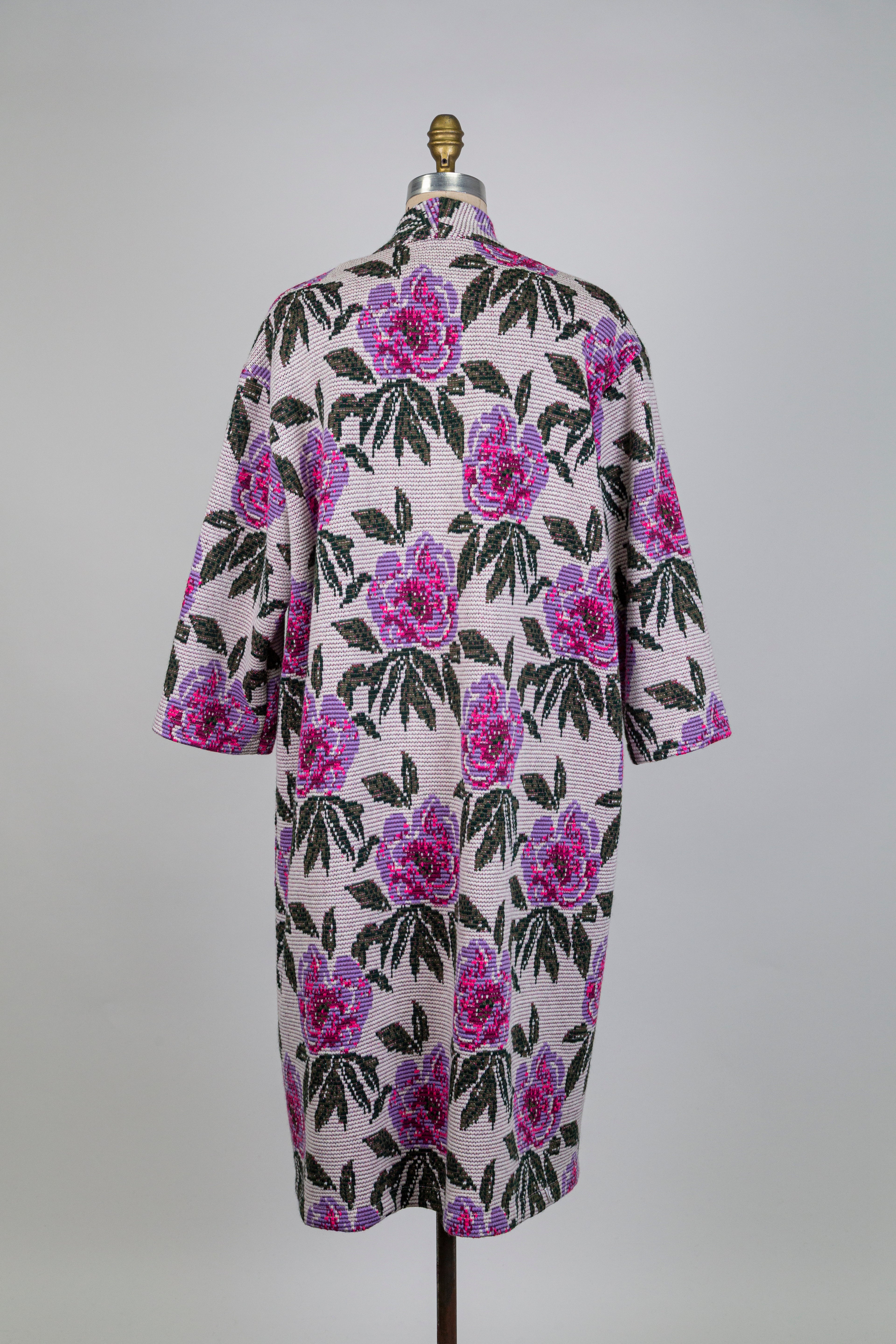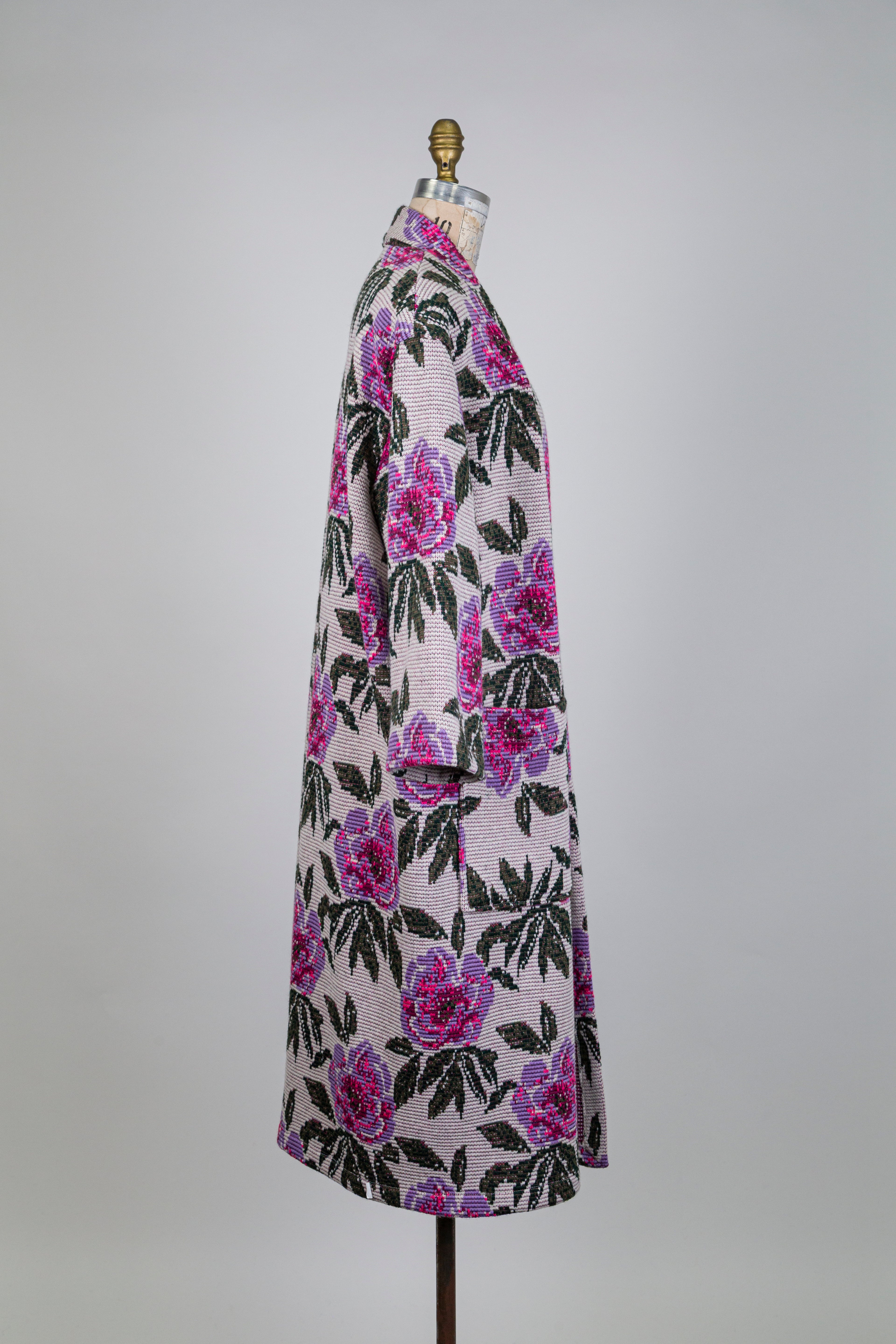 Veste longue crème en jacquard floral mauve, silhouette allongée où le jacquard fleuri mauve apporte raffinement et caractère à la tenue.
