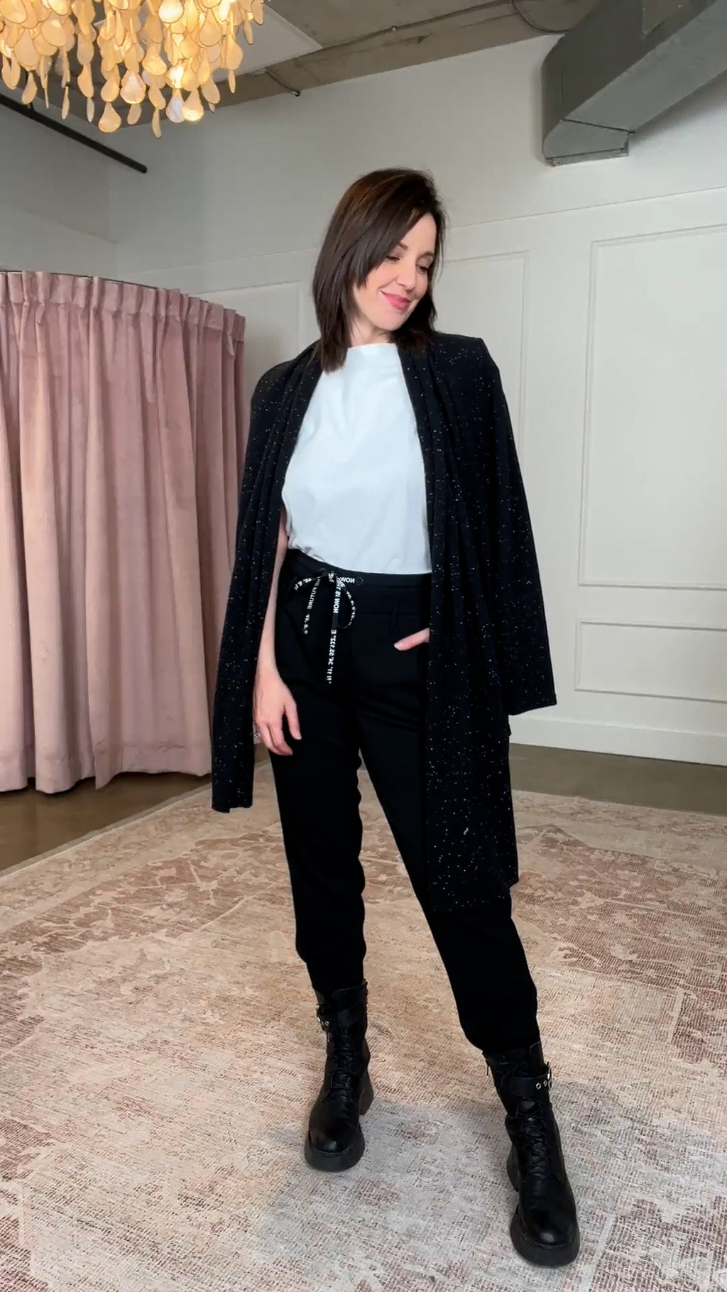 Jogger-style waist insert with printed drawstring