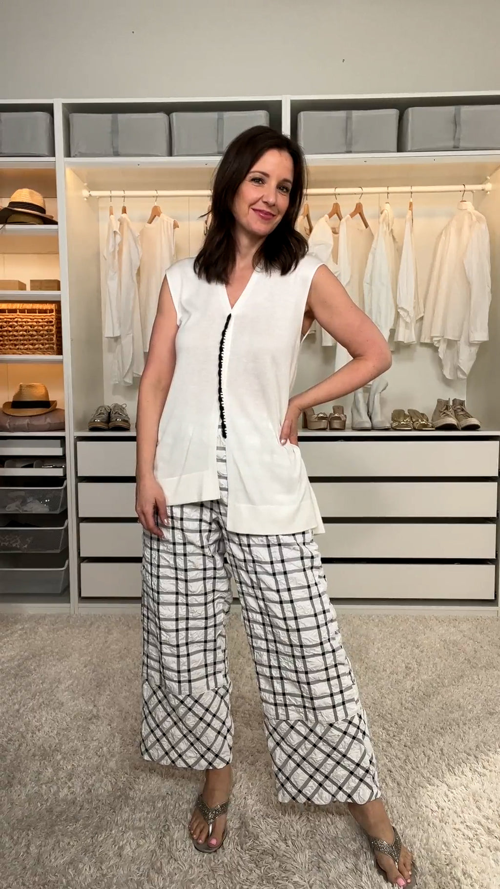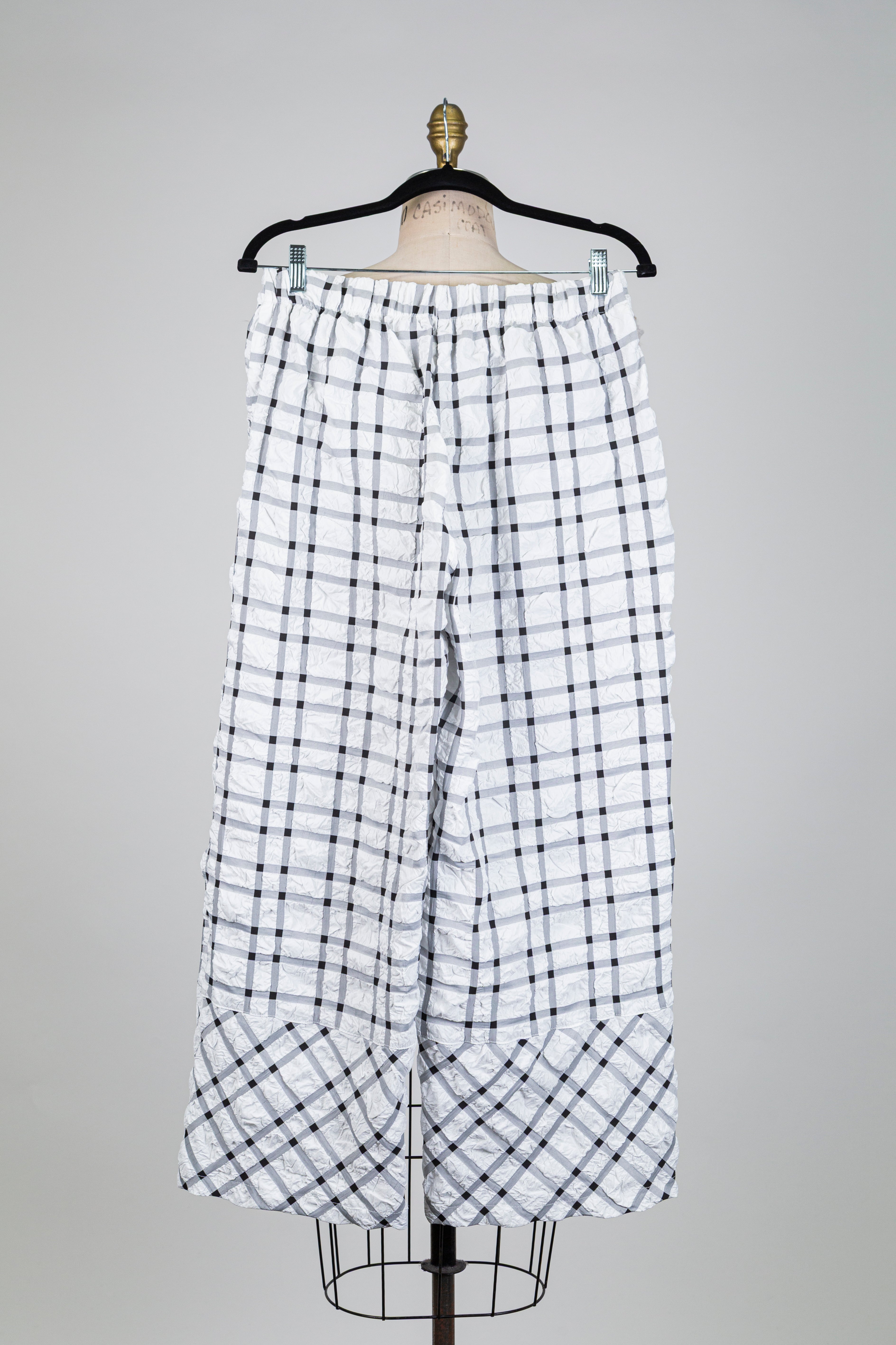 Black tartan white wide-leg trousers with a crinkled effect, a pair of trousers with a strong style whose play on texture and graphic pattern reveal a chic and distinctive look.